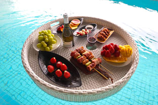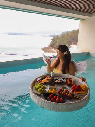 슈가브리움에서 이국적인 느낌을 더욱 진하게 느끼고 싶다면 '플로팅 조식'을 신청해보는 건 어떨까? '플로팅 조식'은 수영하면서 허기를 달랠 수 있는 간단한 음식이 담겨진 '물에 뜨는 바구니' 정도로 이해하면 된다. 원래 동남아 휴양지에서 인기 있던 서비스였는데, 슈가브리움에서도 선보이고 있어 신청하게 됐다.