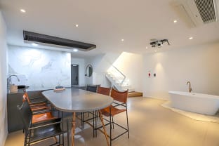 슈가브리움의 '피피 테라스' 객실은 복층 구조로 1층은 부엌 겸 거실이자 풀빌라가 있고, 2층은 침대와 테라스가 있었다. 규모는 약 37평이라 답답함이 없는데다 감각적인 인테리어가 돋보여 객실 안에만 있어도 시간을 보내기 좋았다. 만약 음식을 해먹을 계획이라면, 1층 부엌에는 냄비부터 식기까지 마련되어 있고 인덕션, 냉장고, 전자레인지도 있으니 편리하게 이용해보자.